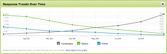 This pattern is an example of the inverse relationship. As the number of campaigns goes up, your audience engagement goes down.